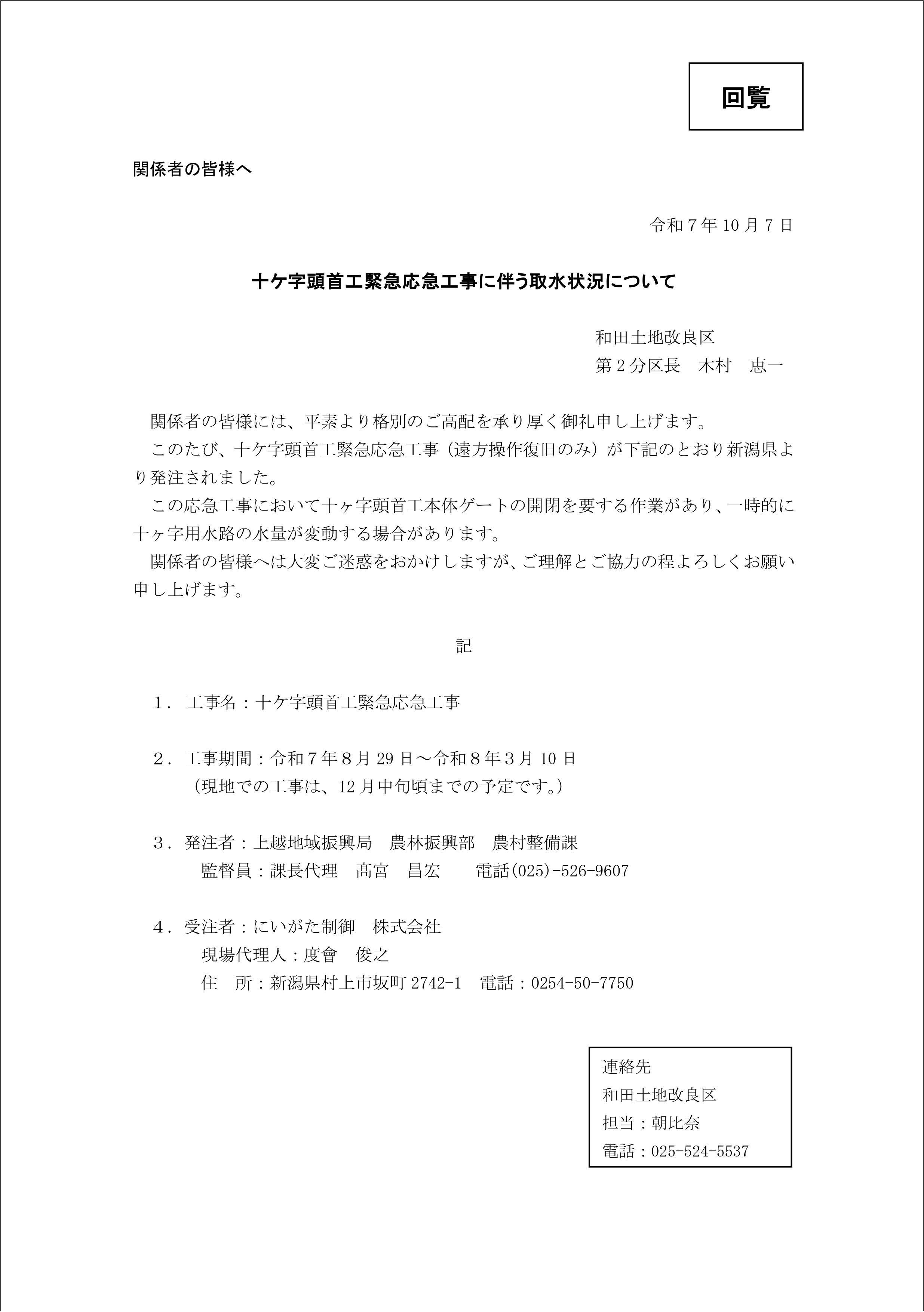 このたび、十ケ字頭首工緊急応急工事(遠方操作復旧のみ)が新潟県より発注されました。 この緊急応急工事に伴い、一時的に十ヶ字用水路の水量が変動する場合があります。 関係者の皆様へは大変ご迷惑をおかけしますが、ご理解とご協力の程よろしくお願い申し上げます。